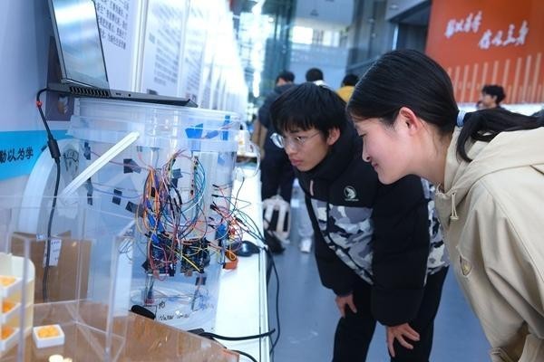 2025年11月19日,学生在北京信息科技大学赛场观看参赛的“沃土新生”智能酵化柜。视觉中国供图